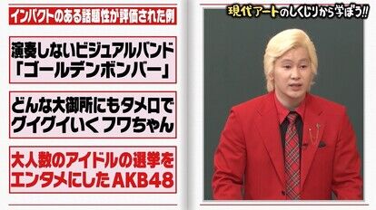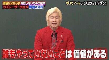 『しくじり先生 俺みたいになるな!!』(テレビ朝日系)に、メイプル超合金のカズレーザーが登場。”現代アートのしくじり“を題材に、「物事の本質を見極めるための授業」を行った。