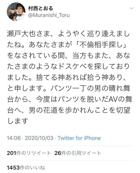 瀬戸大也さま、ようやく巡り逢えましたね。あなたさまが「不倫相手探し」をなされている間、当方もまた、あなたさまのようなドス●ベを探しておりました。捨てる神あれば拾う神あり、と申します。パンツ一丁の男の晴れ舞台から、今度はパンツを脱いだA●の舞台へ、男の花道を歩かれんことを切望します