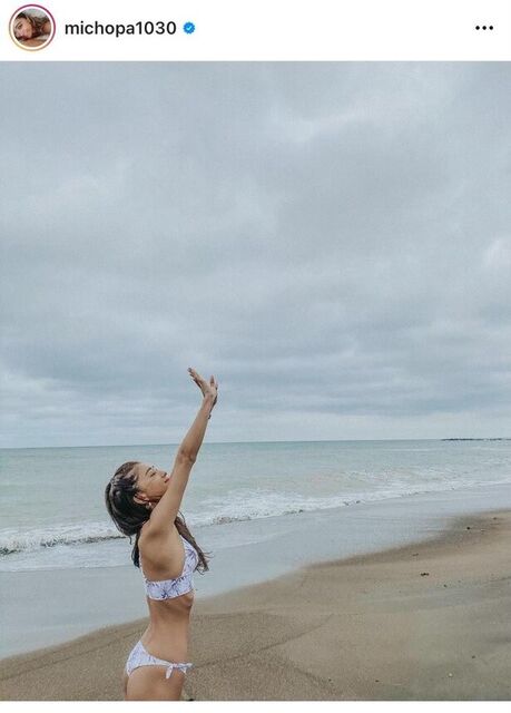 写真には、曇り空の海辺で空に向かって手を伸ばすみちょぱさんが映っている。白い柄物の水着姿だ。横を向いているので、ウエストの細さが強調されている。