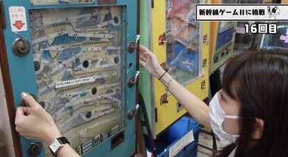 次に挑戦したのは『新幹線ゲームⅡ』。入れた10円玉がそのまま球として使えるこのゲームを、店員のアドバイスを聞きながら進めると初めてにしては上々の出来。これに平成生まれの川口さんもドハマりし、裏ワザを聞いて何度もチャレンジした。何度も続く失敗に「クッソォ!!」と溜息をついたり、頭を抱えたりと色々な表情を見せてくれた。