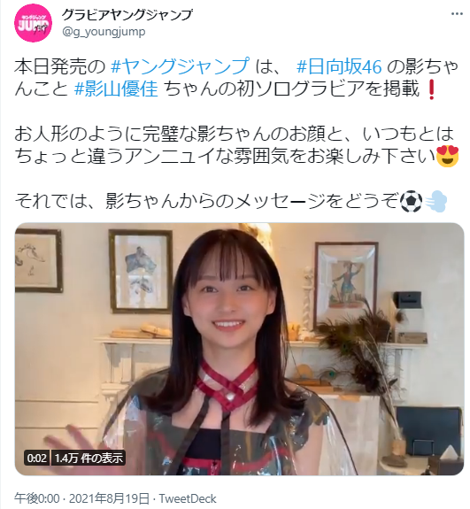 日向坂46の影山優佳(20)が、2021年8月19日発売のマンガ誌「週刊ヤングジャンプ」で、初のソログラビアを披露。お人形のように完璧な顔で、いつもとはちょっと違うアンニュイな雰囲気に挑戦しました。