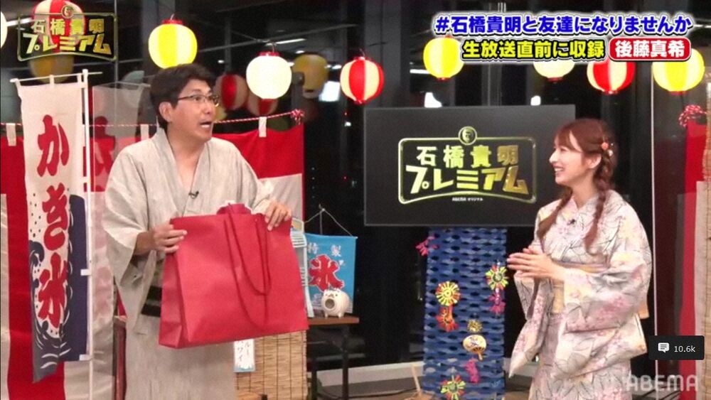 後藤真希(右)から還暦祝いを渡され笑顔の石橋貴明(C)AbemaTV,Inc.