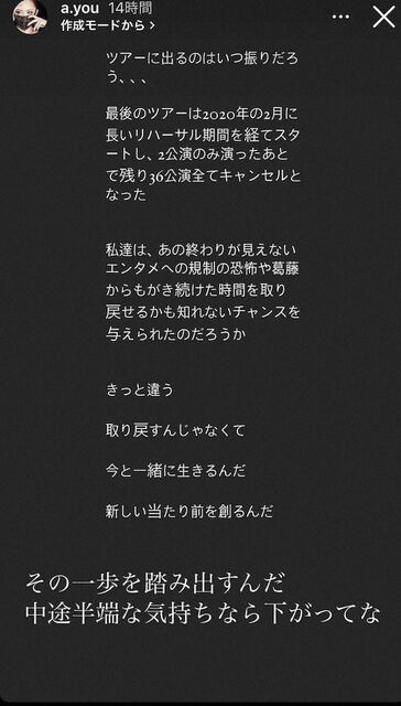 開催まで1カ月を切る中、ツアーへの思いをストーリーに投稿した浜崎。「ツアーに出るのはいつ振りだろう、、、最後のツアーは2020年の2月に長いリハーサル期間を経てスタートし、2公演のみ演ったあとで残り36公演全てキャンセルとなった 私達は、あの終わりが見えないエンタメへの規制の恐怖や葛藤からもがき続けた時間を取り戻せるかもしれないチャンスを与えられたのだろうか きっと違う 取り戻すんじゃなくて 今と一緒に生きるんだ 新しい当たり前を創るんだ その一歩を踏み出すんだ 中途半端な気持ちなら下がってな」と記した。