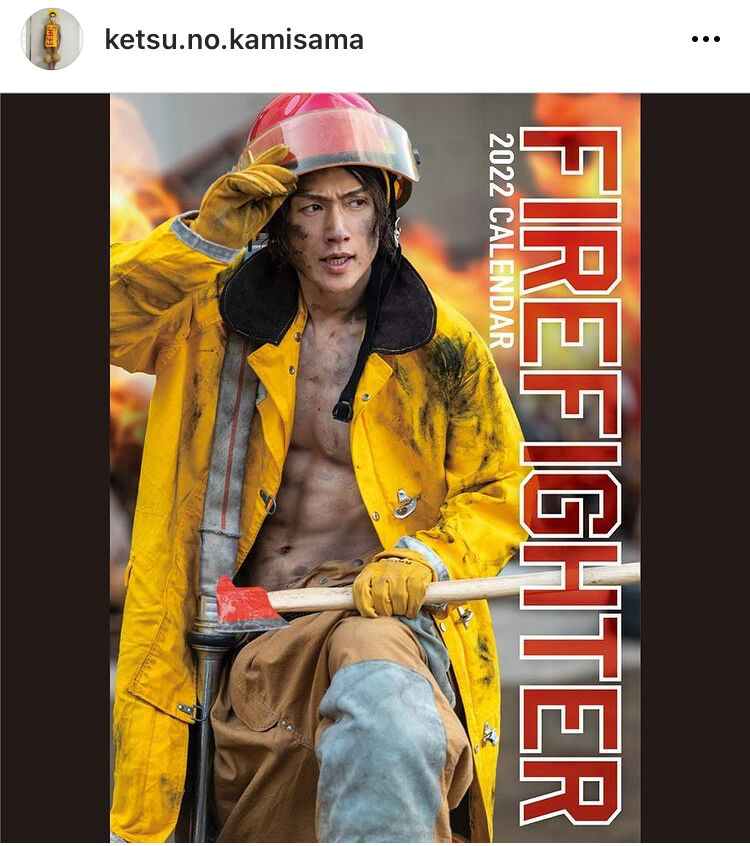 白煙と火の粉が上がる中、樽美酒は上半身裸で子供を抱き抱え、救出中。彼の表情は真剣そのもので、躍動感が凄まじい。この写真は、樽美酒の2022年カレンダー「樽美酒研二 バースデー2021」撮影時の一コマで、子役はSASUKEで親交のある日置将士の御子息だそう。